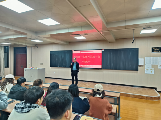 随后,曹老师以《如何做一名优秀的班干部》为主题为2023级全体班干部进行了一场专题培训。培训会上,曹老师从班干部作用、班干部应具备的素养、班干部应具备的能力以及班干部应具备的常识等四个方面指导学生如何做一名优秀的班级学生干部。