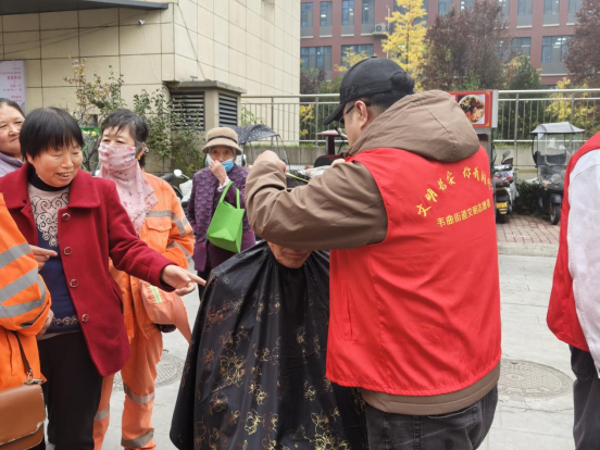 活动筹备阶段,学院积极与学校“头发乱了”理发店的专业理发师冯银江师傅沟通对接,反复敲定活动流程。活动当天,社区门口的理发区在两名志愿者的引导下秩序井然。考虑到老人们的舒适度,志愿者们特意准备了“软质围布”,避免在理发过程中摩擦老人的颈部,让老人感受到贴心的呵护。同时,及时清理碎发,保持环境的整洁。在老人等待理发时,志愿者们主动陪老人聊天,用温暖的话语和有趣的新闻,缓解老人们的焦虑情绪。理发结束后,志愿者们又忙前忙后,协助老人整理衣物、取回物品。对于行动不便的老人,他们更是贴心护送回家,每一个细节都彰显着对老人的关怀,让老人们在这个特殊的日子里感受到了如家人般的温暖。