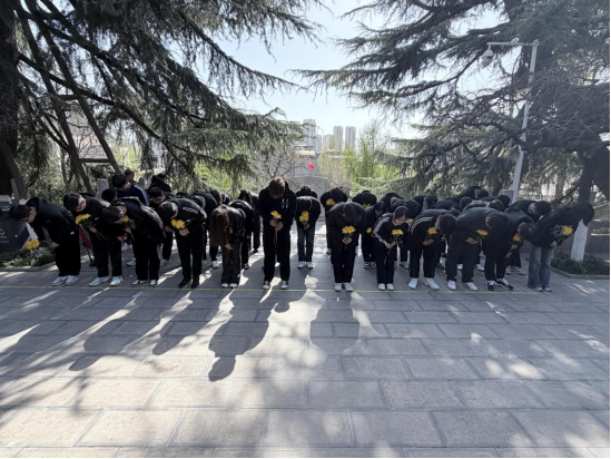 午后的杨虎城将军陵园,苍松翠柏傲然挺立,同学们身着统一服装,列队整齐、神情肃穆,手持鲜花缓步走向烈士纪念碑,每一步都饱含着对革命先烈的深切追思与崇高敬意。