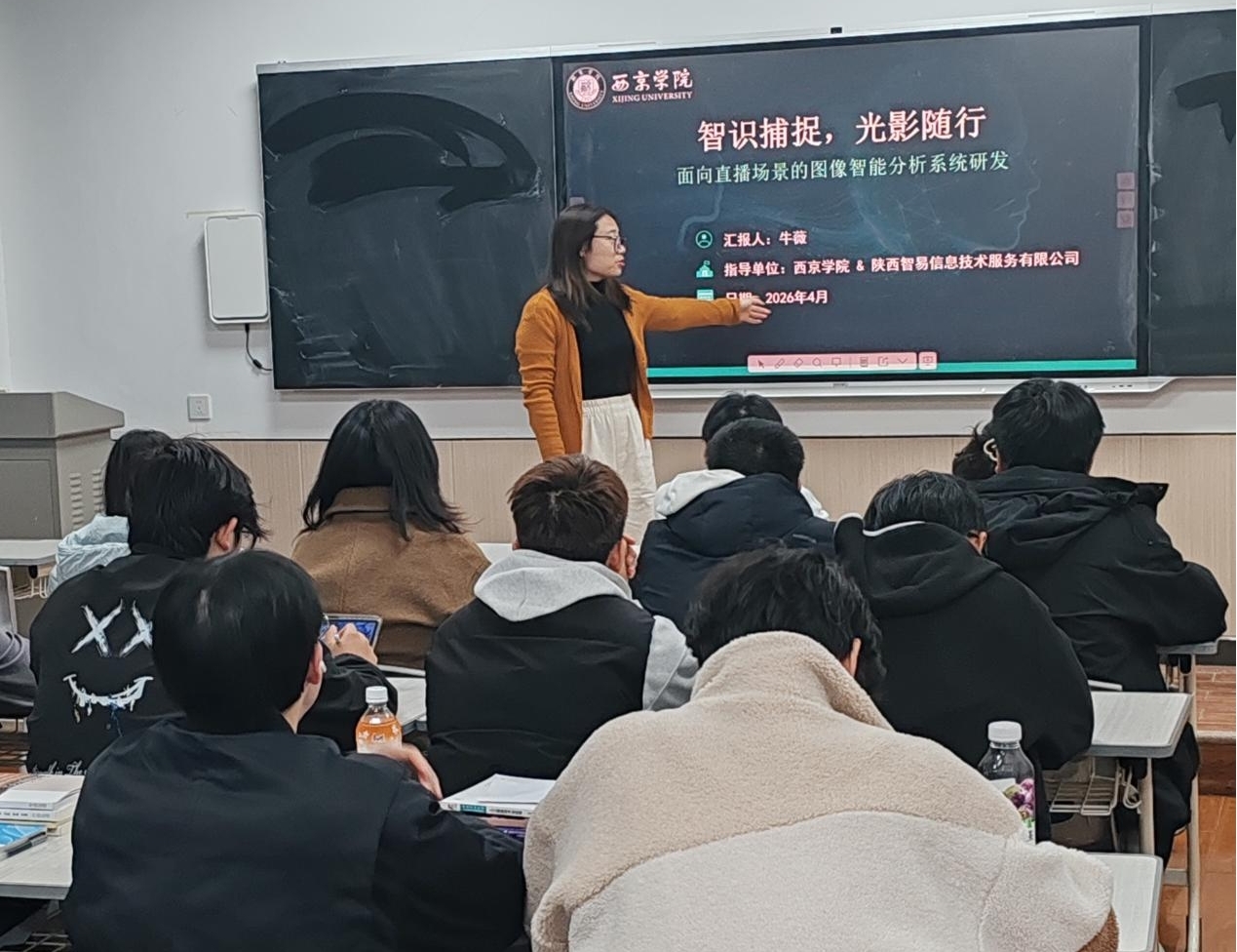 4月12日,机械工程学院在3613教室举办“面向直播场景的图像智能分析系统研发”项目学术报告会。本次报告会由牛薇老师主讲,智能制造工程专业40余名学生聆听了报告。针对直播行业实时性要求高、场景复杂多变等技术难点,牛薇老师从研究背景意义、关键技术算法、系统架构设计、开发实现路径、测试结果分析、应用价值及未来展望六大方面,分享了项目研发成果与实践经验。她介绍了项目研发的两项核心创新——人脸质量评估算法与幻灯片精准截图算法,讲解了基于Python+OpenCV+TensorFlow技术栈搭建的多进程并发系统架构,展示了学院在人工智能与智能制造交叉领域的最新科研成果。